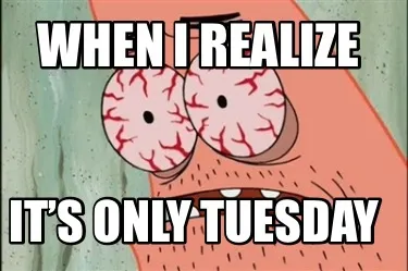 Make your own "Funny When i realize It’s only Tuesday" meme with MemeCreator's free online meme generator. Add text, stickers, and drawings — then download or share. No watermark, no sign-up required.
