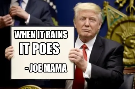 Make your own "Funny When it Rains It POes - Joe Mama" meme with MemeCreator's free online meme generator. Add text, stickers, and drawings — then download or share. No watermark, no sign-up required.