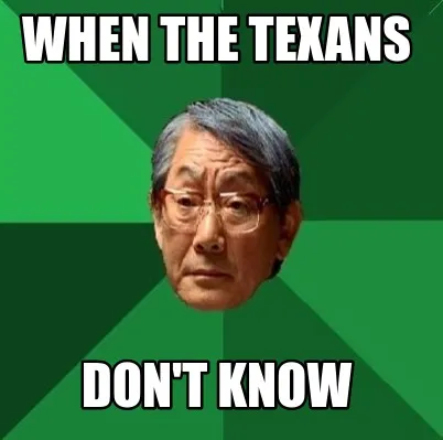 Make your own "When the Texans Don't know" meme with MemeCreator's free online meme generator. Add text, stickers, and drawings — then download or share. No watermark, no sign-up required.