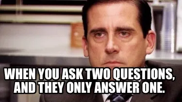 Make your own "When you ask two questions, and they only answer one." meme with MemeCreator's free online meme generator. Add text, stickers, and drawings — then download or share. No watermark, no sign-up required.