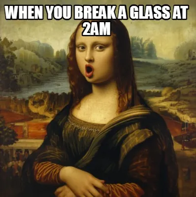Make your own "When You Break A Glass At 2am" meme with MemeCreator's free online meme generator. Add text, stickers, and drawings — then download or share. No watermark, no sign-up required.