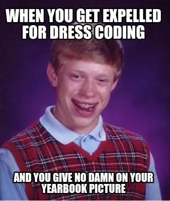 Make your own "Funny When you get expelled for dress coding And you give no damn on your yearbook pic" meme with MemeCreator's free online meme generator. Add text, stickers, and drawings — then download or share. No watermark, no sign-up required.