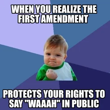 Make your own "When you realize the first amendment Protects your rights to say "WAAAH" in pub" meme with MemeCreator's free online meme generator. Add text, stickers, and drawings — then download or share. No watermark, no sign-up required.