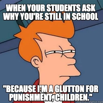 Funny When your students ask why you're still in school "Because i'm a glutton for pun Meme Template