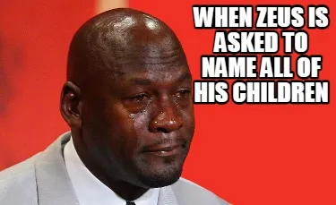 Make your own "Funny When Zeus is asked to name all of his children" meme with MemeCreator's free online meme generator. Add text, stickers, and drawings — then download or share. No watermark, no sign-up required.