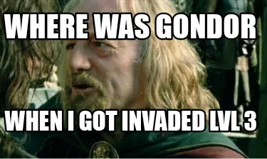 Make your own "Where was gondor When I got invaded lvl 3" meme with MemeCreator's free online meme generator. Add text, stickers, and drawings — then download or share. No watermark, no sign-up required.