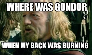 Make your own "Funny Where was gondor When my back was burning" meme with MemeCreator's free online meme generator. Add text, stickers, and drawings — then download or share. No watermark, no sign-up required.