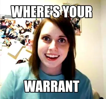 Make your own "Where's your Warrant" meme with MemeCreator's free online meme generator. Add text, stickers, and drawings — then download or share. No watermark, no sign-up required.