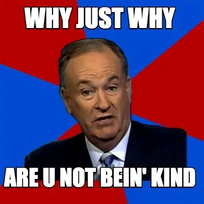 Make your own "WHY JUST WHY ARE U NOT BEIN' KIND" meme with MemeCreator's free online meme generator. Add text, stickers, and drawings — then download or share. No watermark, no sign-up required.