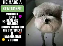 Make your own "WITHOUT BEING READ HIS MIRANDA RIGHTS THEREFORE HIS STATEMENT IS INADMISSIBLE IN COURT" meme with MemeCreator's free online meme generator. Add text, stickers, and drawings — then download or share. No watermark, no sign-up required.