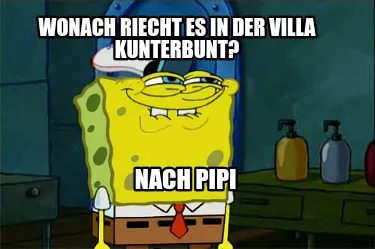 Make your own "Wonach riecht es in der Villa Kunterbunt? Nach Pipi" meme with MemeCreator's free online meme generator. Add text, stickers, and drawings — then download or share. No watermark, no sign-up required.