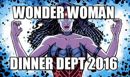 Make your own "Wonder Woman Dinner Dept" meme with MemeCreator's free online meme generator. Add text, stickers, and drawings — then download or share. No watermark, no sign-up required.