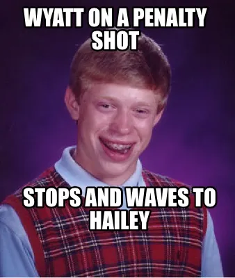 Make your own "Wyatt on a penalty shot Stops and waves to hailey" meme with MemeCreator's free online meme generator. Add text, stickers, and drawings — then download or share. No watermark, no sign-up required.