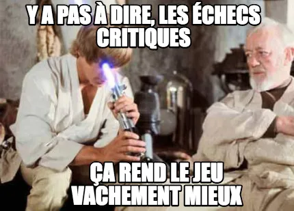 Make your own "Y a pas à dire, les échecs critiques ça rend le jeu vachement mieux" meme with MemeCreator's free online meme generator. Add text, stickers, and drawings — then download or share. No watermark, no sign-up required.