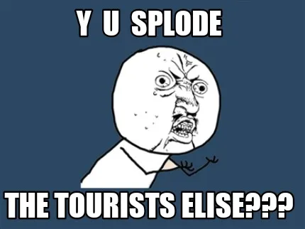 Make your own "Funny Y U Splode The tourists Elise???" meme with MemeCreator's free online meme generator. Add text, stickers, and drawings — then download or share. No watermark, no sign-up required.
