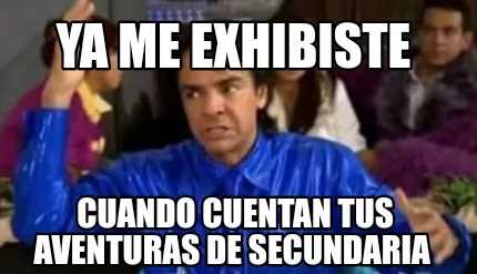 Make your own "Ya me exhibiste Cuando cuentan tus aventuras de secundaria" meme with MemeCreator's free online meme generator. Add text, stickers, and drawings — then download or share. No watermark, no sign-up required.