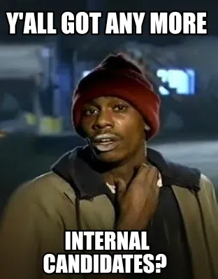Make your own "Funny Y'all got any more Internal candidates?" meme with MemeCreator's free online meme generator. Add text, stickers, and drawings — then download or share. No watermark, no sign-up required.