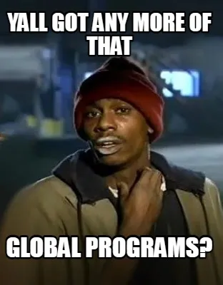 Make your own "Funny Yall got any more of that Global Programs?" meme with MemeCreator's free online meme generator. Add text, stickers, and drawings — then download or share. No watermark, no sign-up required.