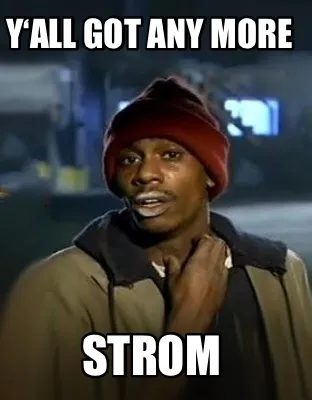 Make your own "Y‘all got any more Strom" meme with MemeCreator's free online meme generator. Add text, stickers, and drawings — then download or share. No watermark, no sign-up required.