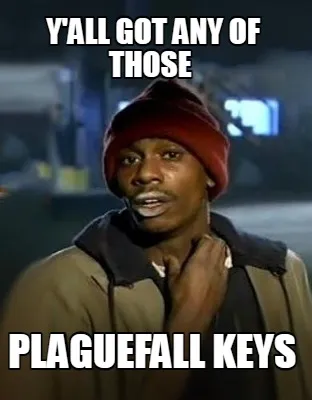 Make your own "Funny y'all got any of those Plaguefall keys" meme with MemeCreator's free online meme generator. Add text, stickers, and drawings — then download or share. No watermark, no sign-up required.