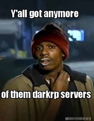 Make your own "Y'all got anymore of them darkrp servers" meme with MemeCreator's free online meme generator. Add text, stickers, and drawings — then download or share. No watermark, no sign-up required.
