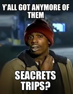 Make your own "Y’all got anymore of them Seacrets trips?" meme with MemeCreator's free online meme generator. Add text, stickers, and drawings — then download or share. No watermark, no sign-up required.