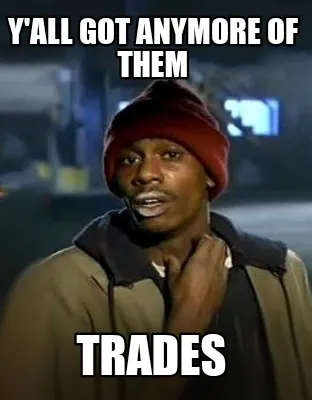 Make your own "Funny Y'all got anymore of them TRADES" meme with MemeCreator's free online meme generator. Add text, stickers, and drawings — then download or share. No watermark, no sign-up required.