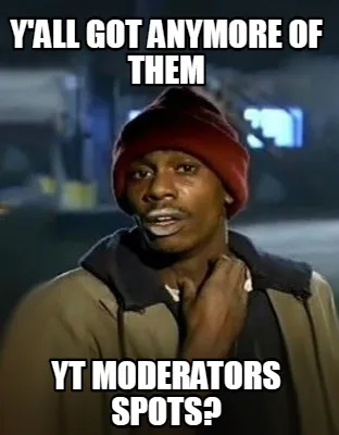 Make your own "Y'all got anymore of them YT moderators spots?" meme with MemeCreator's free online meme generator. Add text, stickers, and drawings — then download or share. No watermark, no sign-up required.