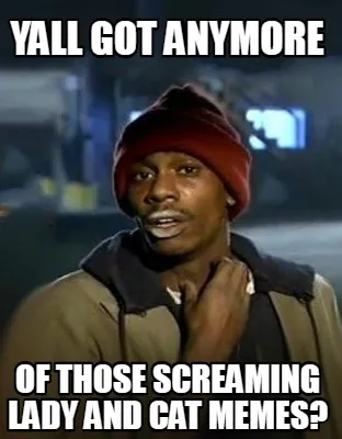 Make your own "Yall got anymore of those screaming lady and cat" meme with MemeCreator's free online meme generator. Add text, stickers, and drawings — then download or share. No watermark, no sign-up required.