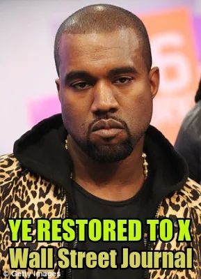 Make your own "Ye restored to X Wall Street Journal" meme with MemeCreator's free online meme generator. Add text, stickers, and drawings — then download or share. No watermark, no sign-up required.