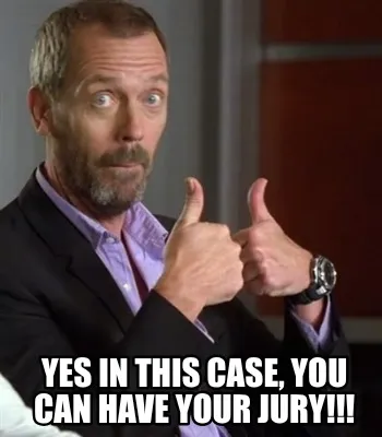 Make your own "Yes in this case, you can have your jury!!!" meme with MemeCreator's free online meme generator. Add text, stickers, and drawings — then download or share. No watermark, no sign-up required.