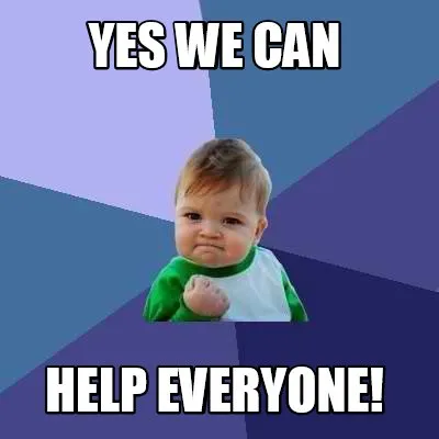 Make your own "YES WE CAN HELP EVERYONE!" meme with MemeCreator's free online meme generator. Add text, stickers, and drawings — then download or share. No watermark, no sign-up required.