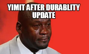 Make your own "Yimit after durablity update" meme with MemeCreator's free online meme generator. Add text, stickers, and drawings — then download or share. No watermark, no sign-up required.