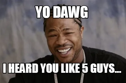 Make your own "Yo dawg i heard you like 5 guys..." meme with MemeCreator's free online meme generator. Add text, stickers, and drawings — then download or share. No watermark, no sign-up required.