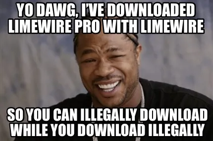 Make your own "Yo Dawg Ive Downloaded Limewire Pro With Limewire So You Can Illegally Download" meme with MemeCreator's free online meme generator. Add text, stickers, and drawings — then download or share. No watermark, no sign-up required.