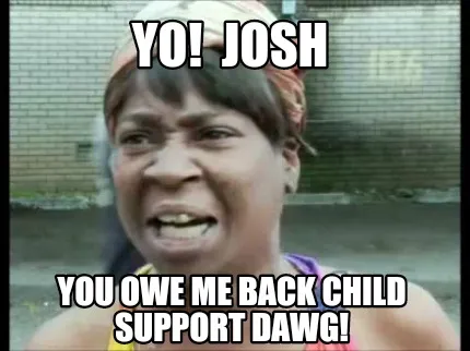 Make your own "Yo! Josh You owe me back child support dawg!" meme with MemeCreator's free online meme generator. Add text, stickers, and drawings — then download or share. No watermark, no sign-up required.