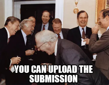 Make your own "You can upload the submission" meme with MemeCreator's free online meme generator. Add text, stickers, and drawings — then download or share. No watermark, no sign-up required.