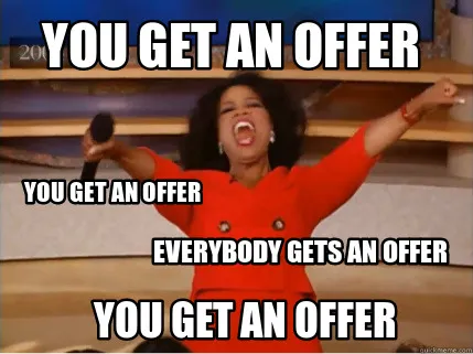 You get an offer you get an offer You get an offer Everybody gets an offer Meme Template
