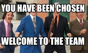 Make your own "Funny You have been chosen Welcome to the team" meme with MemeCreator's free online meme generator. Add text, stickers, and drawings — then download or share. No watermark, no sign-up required.