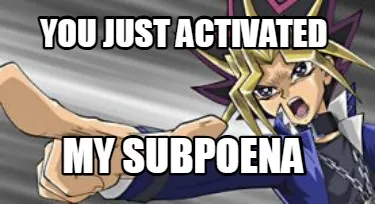 Make your own "Funny You just activated my subpoena" meme with MemeCreator's free online meme generator. Add text, stickers, and drawings — then download or share. No watermark, no sign-up required.