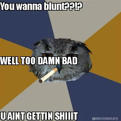 Make your own "You wanna blunt??!? WELL TOO DAMN BAD U AINT GETTIN SHIIIT" meme with MemeCreator's free online meme generator. Add text, stickers, and drawings — then download or share. No watermark, no sign-up required.