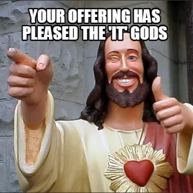 Make your own "Your offering has pleased the 'IT' Gods" meme with MemeCreator's free online meme generator. Add text, stickers, and drawings — then download or share. No watermark, no sign-up required.