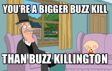 Make your own "You’re a bigger buzz kill Than buzz killington" meme with MemeCreator's free online meme generator. Add text, stickers, and drawings — then download or share. No watermark, no sign-up required.