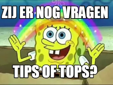 Make your own "Zij er nog vragen tips of tops?" meme with MemeCreator's free online meme generator. Add text, stickers, and drawings — then download or share. No watermark, no sign-up required.